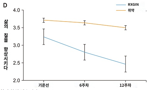 발기기능, 오르가즘기능, 성교만족 하위점수도 RXGIN군에서 12주(p=0.0047, p=0.0204, p=0.0452)로 연령과 BMI를 조정하지 않은 위약군에 비해 유의하게 향상되었습니다.